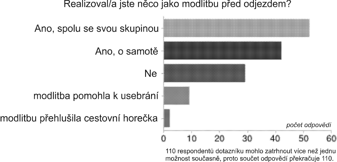 Pokud se do Taizé vypraví organizovaná skupina, není od věci pomodlit se v autobuse, zazpívat si, případně objasnit organizační záležitosti nebo sdělit vlastní zkušenosti z předchozích pobytů. Ideální je tedy autobus s mikrofonem, ve kterém sedí také vedoucí skupiny – kněz nebo farář, kterého ostatní členové výpravy uznávají jako autoritu a jsou schopní se na jeho projevy soustředit. Většina respondentů dotazníku realizovala modlitbu před odjezdem ať už ve skupině nebo o samotě: